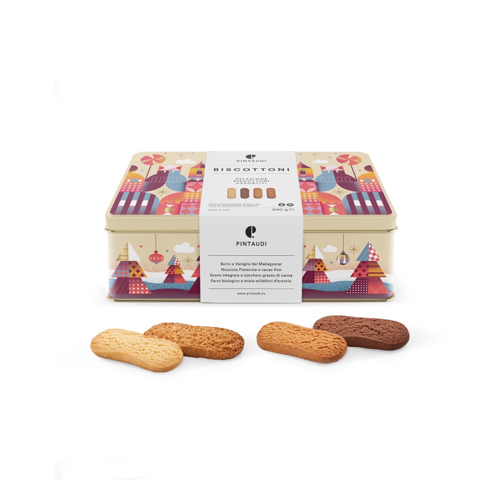 Descoperiți Cutia de Biscottoni Assortiti de Crăciun de la Pintaudi, o colecție elegantă de biscuiți artizanali, realizată din cele mai fine ingrediente. În interior, veți găsi patru varietăți delicioase: